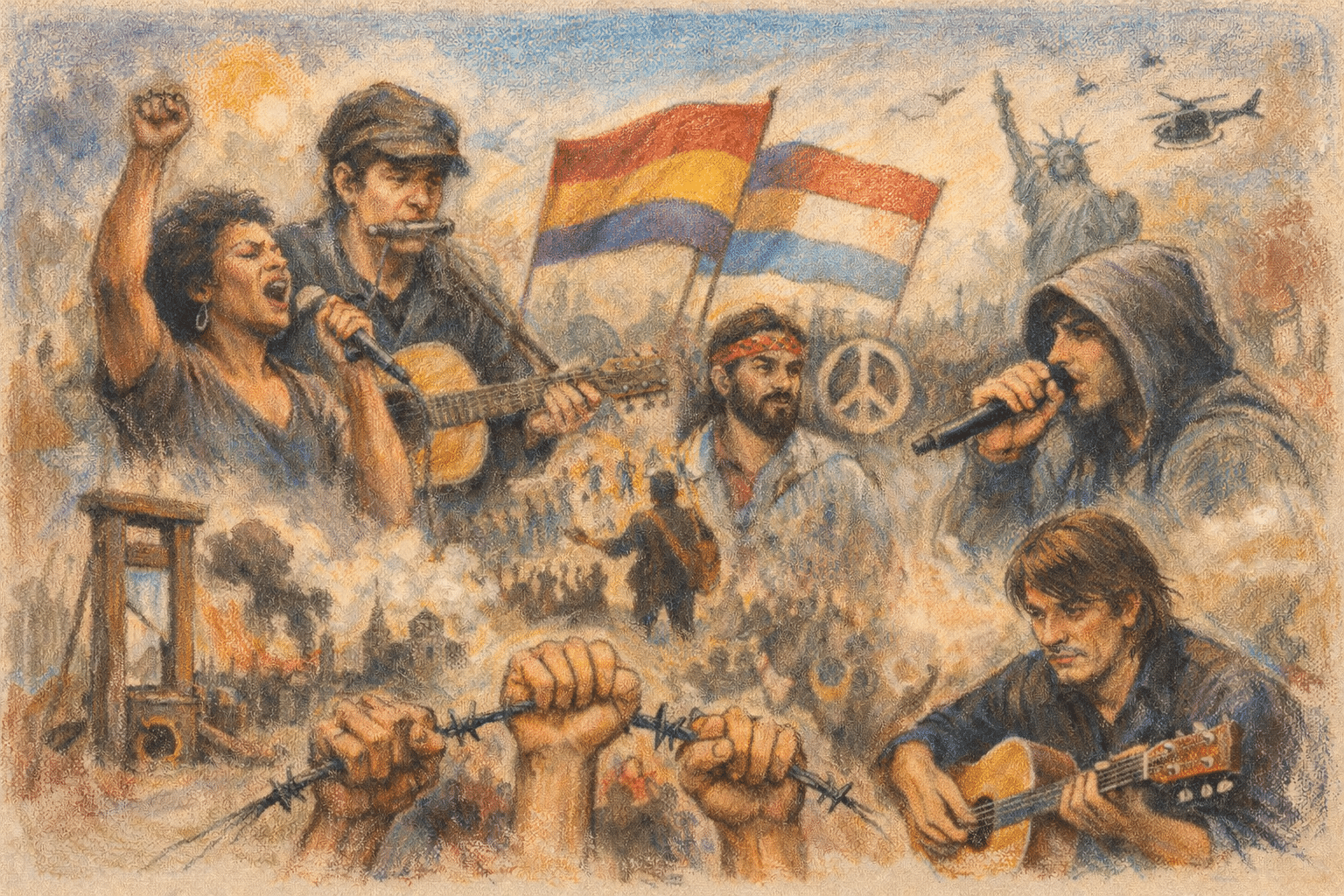 La così definita “musica di protesta” conduce allo specifico filone che parte dal periodo della controcultura hippie con i pezzi divenuti leggendari quali “We shall overcome” e “Blowin’ in the wind”, fino ai successivi generi del punk e del rock, con artisti quali i Ramons, gli U2 fino ad arrivare alle voci di artisti come Beyoncé e Kendrick Lamar. Anche in Italia l’utilizzo della musica come strumento espressivo ha radici consolidate: la stessa “Bella ciao” è solo un esempio forse il più famoso ma come non citare autori quali De Andrè e Giorgio Gaber, e il più recente Caparezza.