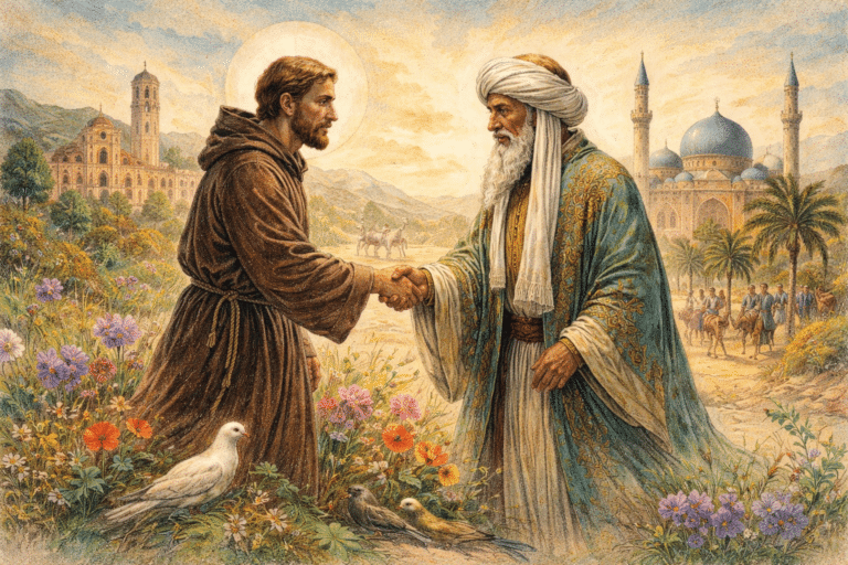 Francesco d’Assisi è uno dei più grandi santi, se non il più grande, della cristianità oggi purtroppo spesso e volentieri ridotto a banale e stucchevole icona di certo ambientalismo e pacifismo “cattolico”. Niente di più lontano da un personaggio che nel settembre 1219, durante la quinta crociata, caldamente sconsigliato, attraversò le linee nemiche per recarsi al cospetto del sultano al-Malik al-Kamil, nipote del terribile Saladino nell’intento di presentare la sua fede. Entrambi non rinnegarono le loro identità e anzi Francesco, di fronte alla irremovibilità dell’interlocutore, concluse l’incontro dicendo che i crociati facevano bene a combattere i mussulmani il cui intento era strappare le popolazioni all’unica vera fede in Cristo.