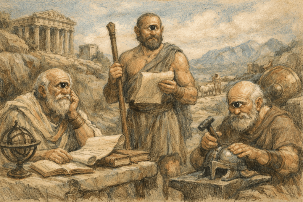 - Fonti ed Autori: I ciclopi sono tra le popolazioni più citate dagli studiosi greci, tra questi troviamo Esiodo con la sua Teogonia, Omero nell’Odissea. Anche Plinio il Vecchio ne parlò nel suo Naturalis Historia, terzo libro settimo capitolo.