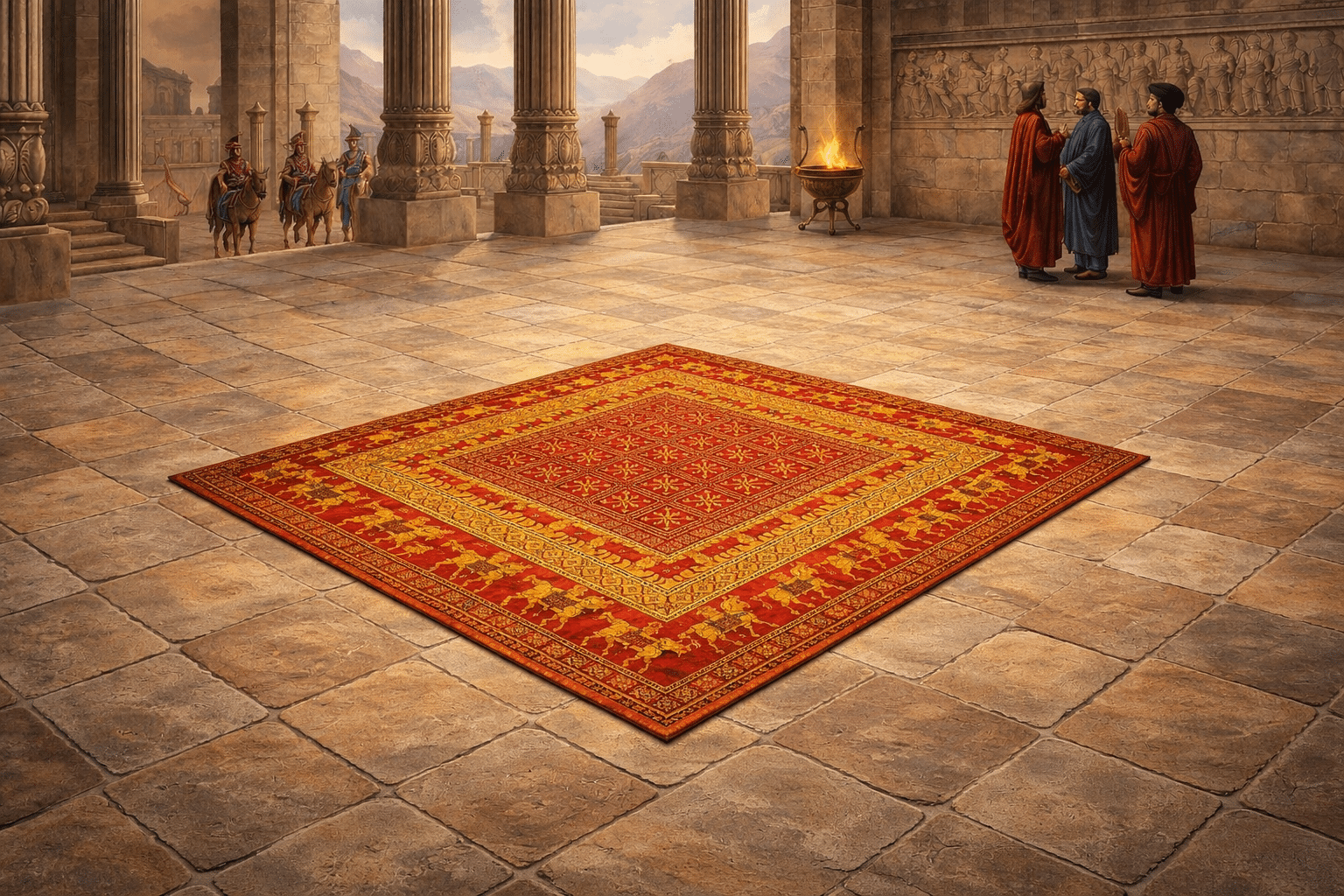 - Origine persiana/achemenide (ipotesi più diffusa): i motivi dei cavalli e dei grifoni sono quasi identici ai rilievi di Persepoli; il nodo turco era diffuso nell’Impero achemenide; i colori e la raffinatezza rimandano a botteghe di corte iraniche.