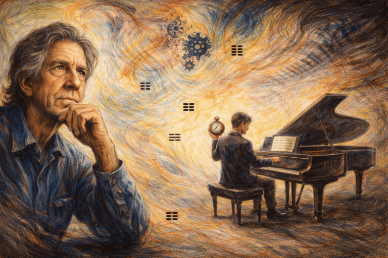 Queste idee influenzarono profondamente Cage e lo portarono a concepire la musica come processo naturale, non come espressione personale. Per mettere in pratica questa filosofia, Cage iniziò a usare l’antico testo cinese I Ching, noto anche come Libro dei Mutamenti. Tradizionalmente l’I Ching viene consultato lanciando monete o bastoncini, che generano combinazioni numeriche chiamate esagrammi. Cage trasformò questo metodo in strumento compositivo. Per esempio, il risultato dei lanci poteva determinare: altezza delle note, durata dei suoni, dinamica, densità sonora, struttura formale. In questo modo la musica non veniva più decisa completamente dal compositore, ma emergeva da un processo casuale.