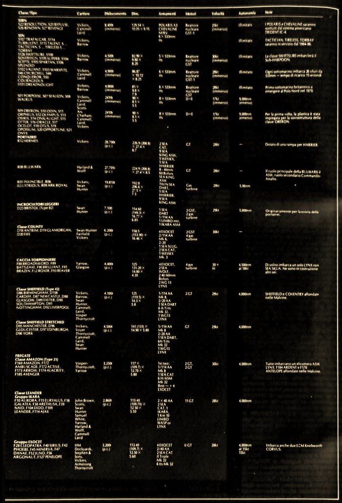 Il meglio della Royal Navy è oggi sott’acqua. Non è una battuta ma la realtà visto che le migliori unità in assoluto sono gli SSN. La semplice presenza di due battelli inglesi nelle acque dell’Atlantico meridionale ha fatto rimanere nei porti l’intera Armada Argentina e con ottime ragioni visto che alla sua uscita il GENERAL BELGRANO è incappato in un siluro del CONQUEROR peraltro di modello superato, visto che si trattava di un Mk 8 risalente alla II G. M. Vista la fine dell’incrociatore si può capire come nessuna nave argentina di un certo tonnellaggio sia uscita in mare.