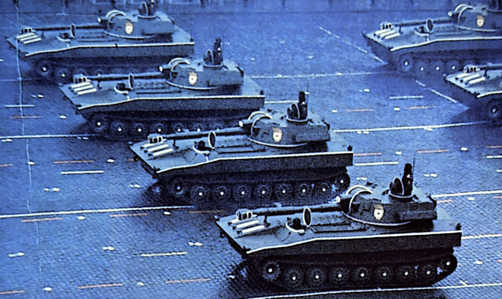Per accompagnare i carri ha fatto la sua comparsa la versione del BMP modificata alla luce delle esperienze dell’Ogaden e dell’Afghanistan. Si era detto che il BMP aveva denunciato alcuni inconvenienti per ciò che concerneva il suo armamento e che ne era allo studio una variante dotata di armamento simile a quello degli AIFV occidentali. Nel novembre dello scorso anno è stata ufficialmente presentata tale nuova versione da molte fonti ampiamente anticipata.
